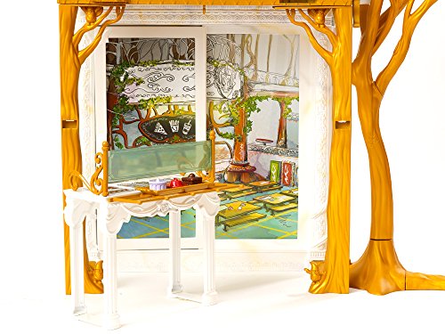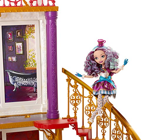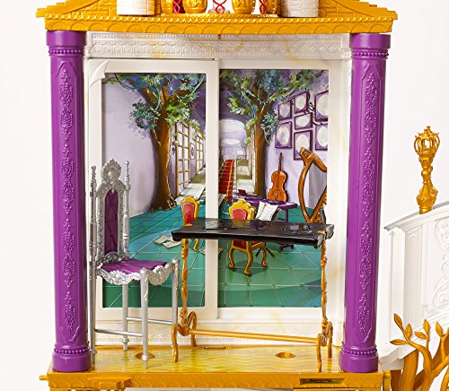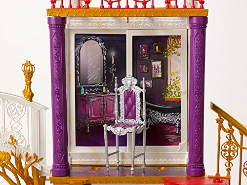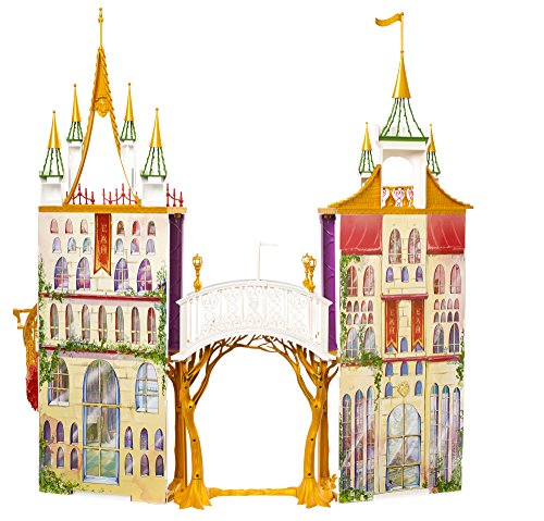 Open this book to reveal a play set that transforms from fairytale castle to Ever After High school for all types of tales. The 3.5' x 3.5' turreted structure features two stories, four character-themed rooms, a gliding bridge and a winding staircase that lets dolls (sold separately) ride all the way down! On the first floor are a surprise vanity inspired by Holly O'Hair and a living room with sofa themed for Apple White; the second floor is home to a closet perfect for Ashlynn Ella and a bathroom with royal throne designed for Raven Queen. But wait -- each room transforms from a castle theme to a high school setting with the flip of a wall. Turn the closet into music class and flip the mirror over for a desk! Turn Holly's vanity into the lunch buffet. It's double the storytelling fun!.Feature
