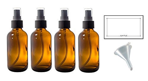 4 oz Amber Glass Boston Round Treatment Pump Bottle (4 pack) + Funnel and Labels for essential oils, aromatherapy,food grade, bpa free