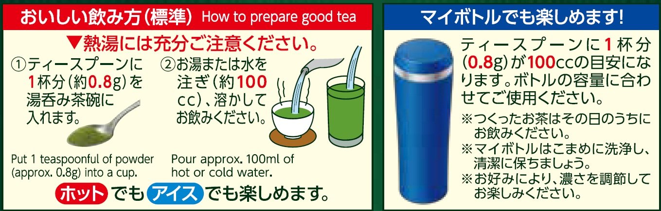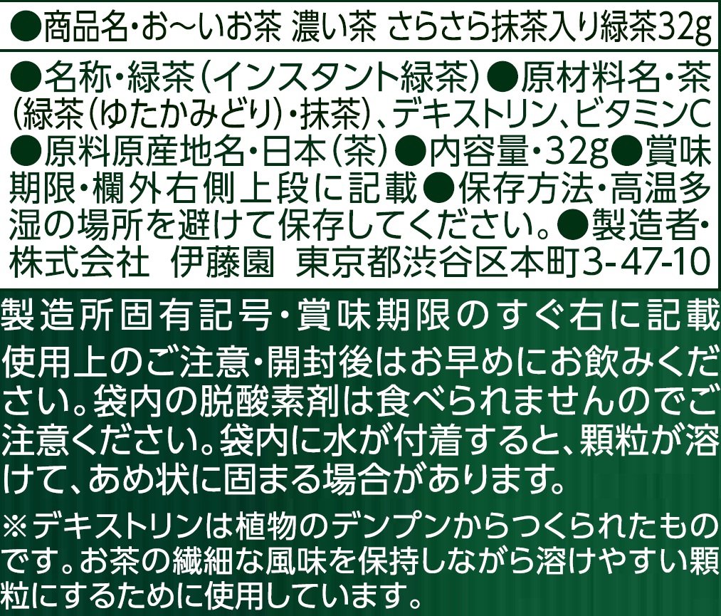 原材料:茶(緑茶(ゆたかみどり)・抹茶), デキストリン, ビタミンC商品サイズ(高さx奥行x幅):170mmx55mmx120mm商品紹介水でもお湯でもすぐとける、健康成分カテキン豊富なインスタント緑茶。(1袋あたり3,400mg含有) 渋みのきいた濃いめの緑茶に、味わいまろやかな抹茶をブレンド。カテキンを豊富に含む、国産茶葉『ゆたかみどり』100%使用。※ゆたかみどり特性・・・苦渋みが強く、形状がやや大型。被覆を行い、蒸しを強くすることで、濃厚な水色と味になります。