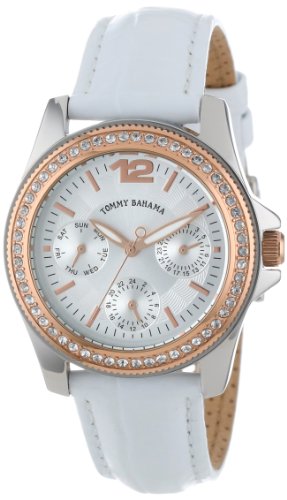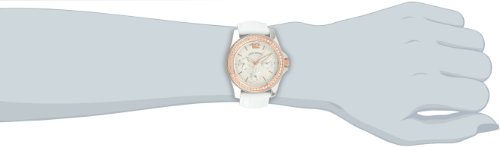 Dress watch, Japanese quartz movement, Multifunction featuring 24-hour, day and date subdials, Polished rose-gold-tone hands, Polished rose-gold-tone sweep seconds, Polished rose-gold-tone hands mark subdials, Applied polished rose-gold-tone Arabic twelve, Applied polished rose-gold-tone baton markers, Black print, Arabic numbers and indices mark subdials, Black indices form surrounding minute track, Brushed silver-tone dial with wave-textured inner circle and black logo below twelve o'clock position, White croc-embossed genuine leather strap with contrast stitching and polished silver-tone stainless steel buckle, Polished rose-gold-ion-plated stainless steel bezel encrusted with crystals, Oversize polished silver-tone stainless steel round case, Protected rose-gold-ion-plated steel crown, Stainless steel caseback, Mineral crystal, 5 ATM (50 meters/165 feet water resistant)Feature