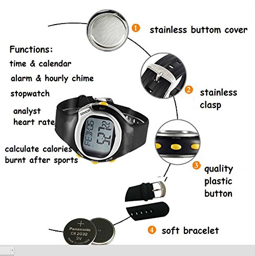 -. Feature : Stainless steel back , Water resistant / Analyst the Heart Rate and calculate the Calories Burnt after exercise / Exercise Intensity input for Calories analyzing / Chronograph (Stopwatch) with split lap time for recording exercise time / Display current Time & Calendar with Alarm and Hourly Chime function