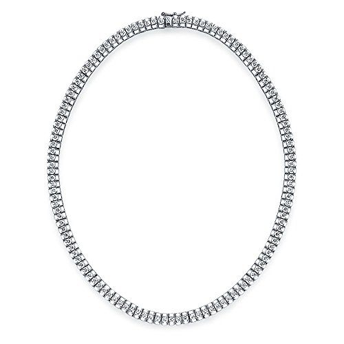 Our Cubic Zirconia tennis necklace is made of rhodium plated brass and features a string of 3mm round cut colorless Cubic Zirconia stones set in four prong settings. The tennis necklace is secured with a box snap clasp and safety wing for secure wear, so you do not have to worry as you wear it for a night on the town. It features 120 cz stones for a total of 12 Carats It is a sensational match for your tennis bracelet, this is one of our most popular pieces this season and is a perfect length for most women. It makes a fashion statement that is timeless and classic. I Mark the next special occasion with the gift of a spectacular, sparkling piece of fashionable jewelry that exudes glamour and personality. A stunning accessory can change the look of an outfit in an instant. As April birthstone jewelry, this is a proven winner. Order yours today.Feature