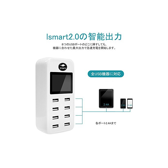 ★급속 충전 가능&야시공재능 부착:8개의 USB포토의 어디에 꽂는 도기기 에 맞게 한 최대 출력에 급속 충전을 개시합니다.전포토2.4A의 고출력 대응에서,어느 포토에 어떤 기기를 접속해도 급속 충전OK입니다.※각 포토2.1A까지,전포토 합계8A까지 출력.LED스크린 부착,어둠에서도 충전 상태가 곧 알 수 있습니다.