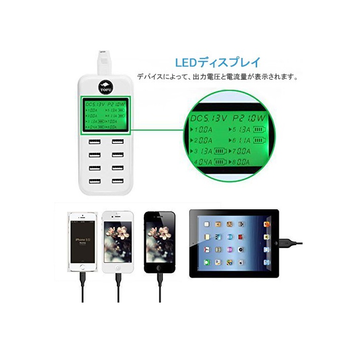 ★8대동시에 충전&출력 자동 판별 기능:타블렛,《스마호》,충전기,디지탈 카메라,게임기,wi-fi루터,모바일 충전기 등,모든 기기를 최대8대까지 동시 충전 할 수 있는AC충전기입니다.본체에는 LED디스플레이가 붙고 있고, 디바이스에 의해출력 전압과 전유량이 표시됩니다.