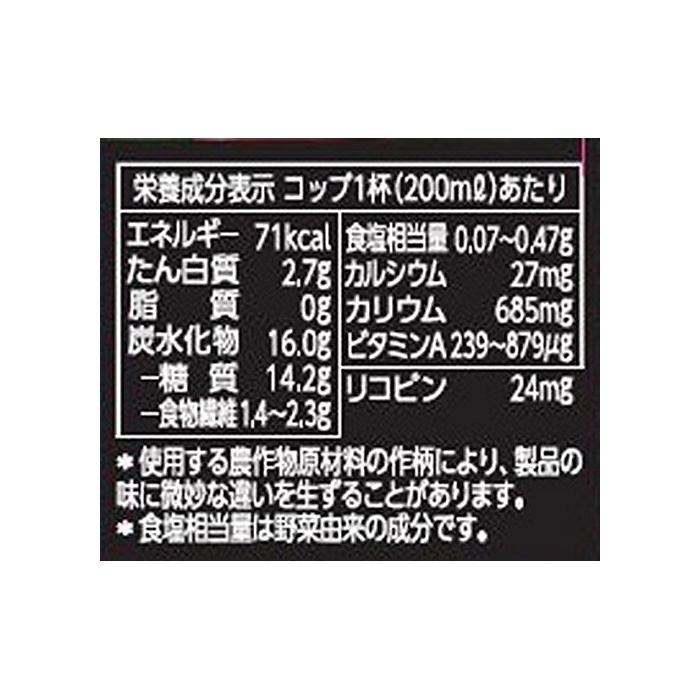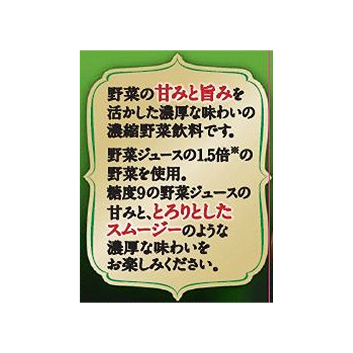 원재료:토마토 퓌레《―》,(당근)인삼즙,(당근)인삼퓌레《―》,시금치즙,양상추즙,무우 엑기스,평지의 변종즙,읽 # 엑기스,친 겐 코뿔소 엑기스,K《루》즙,비츠즙,타마 파 엑기스,파슬리즙,래디시즙,《구레손》즙,아스파라거스즙,양배추즙,콜리플라워즙,피망즙,호박즙,브로콜리즙/신맛료