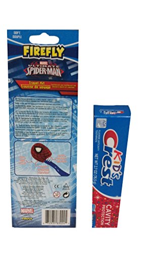 - Feature : FireFly - Marvel Spider-Man Soft Toothbrush Travel Kit / Kids' Crest Cavity Protection Toothpaste 2.7 oz / Fun Filled Sparkles and Sparkle Fun Flavor that Kids Love / Toothbrush has a Spider-Man Cap with a Powerful Suction Cup to Stick to Wall / Recommended for Children Over 3 years (Choking Hazard)