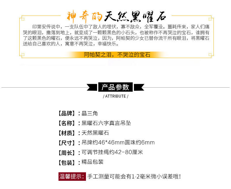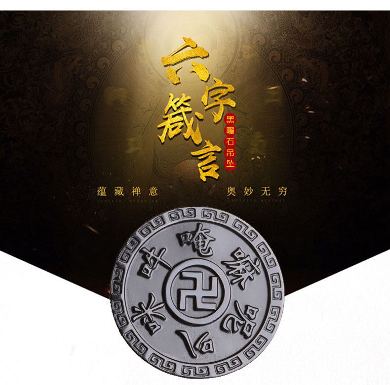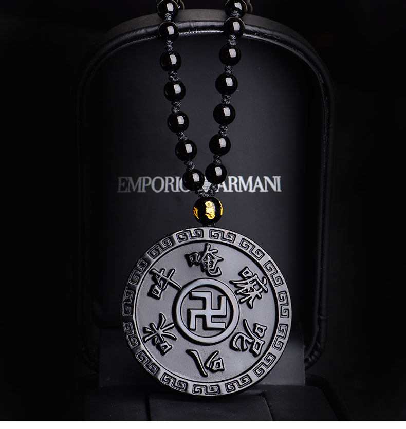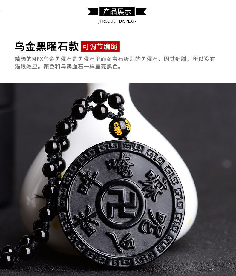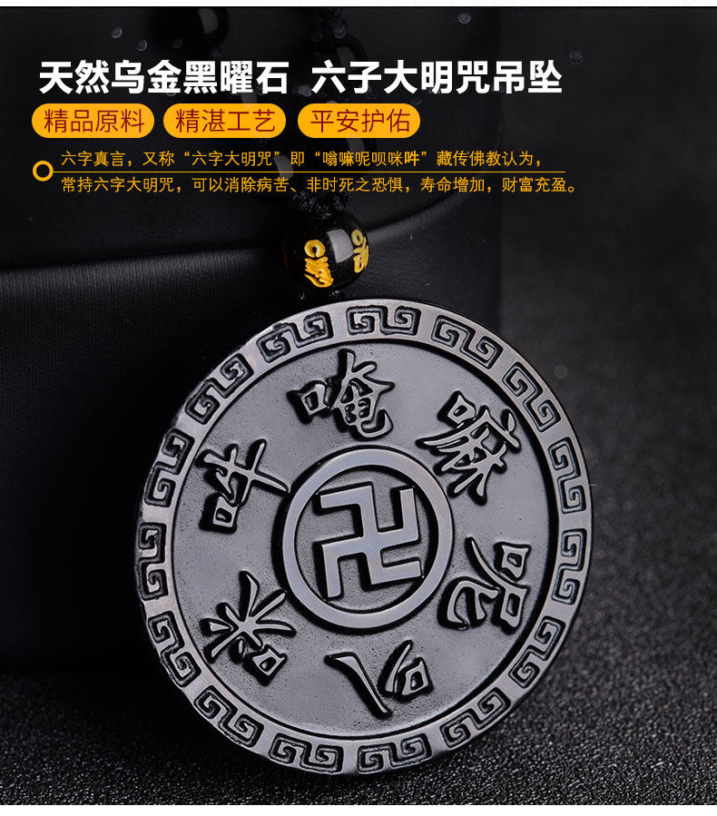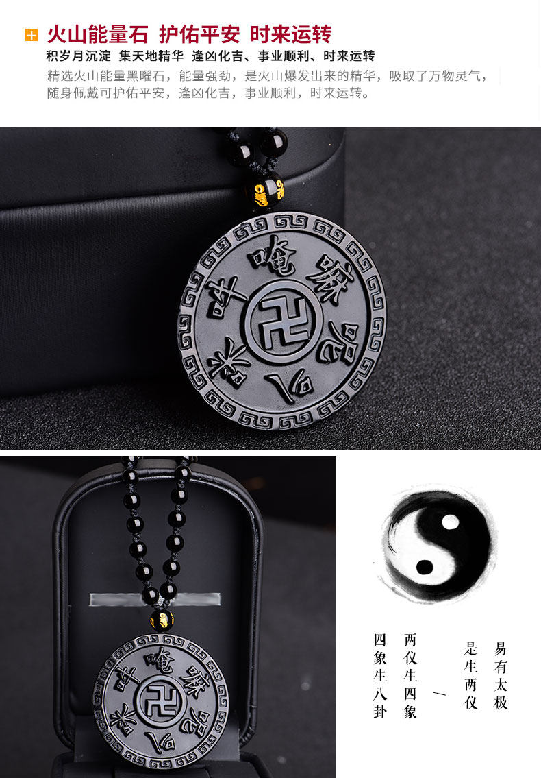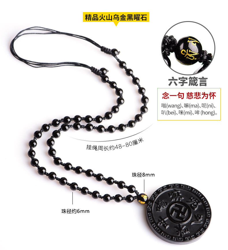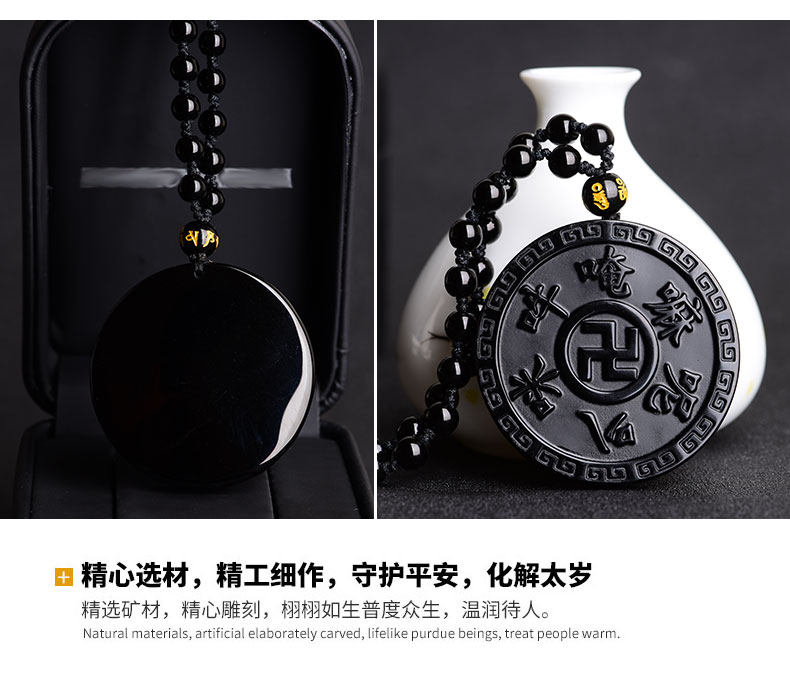 开光天然黑曜石六字真言吊坠 大明咒梵文男女款项链佛教饰品挂件