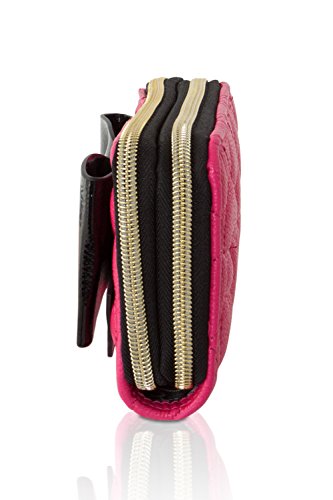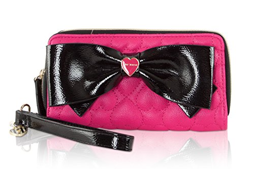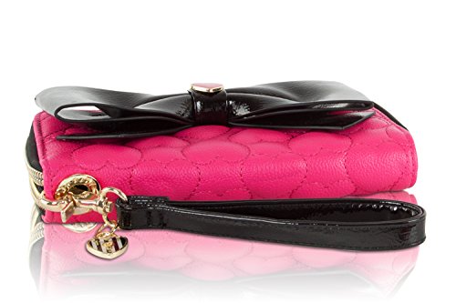 For the perfect blend of fashion and function, get the stylish Betsey Johnson Wristlet Wallet. It's constructed of PVC quilted detail, front logo Big bow, removable wrist strap, The wallet features the Double storage space, with 5 cc slots, 4 bill pockets, and ID window, Back zip compartment with 2 bill pockets and center coin pocket. Packaged in a signature gift box it will make the perfect gift for someone special!Feature