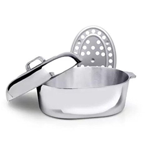 -. Feature : 10-quart capacity / For use on top of the range and in the oven; ideal for lengthy simmering / The cast-aluminum roaster is made with a polished aluminum exterior that eliminates surface hot spots / Thick, energy-saving bottom transfer heat quickly to thin walls so you can cook with lower heat / Heavy lid locks-in juices to reduce moisture loss during cooking