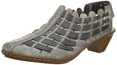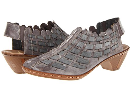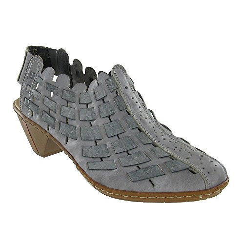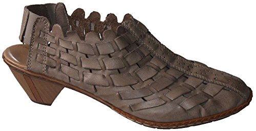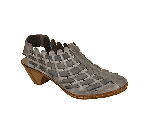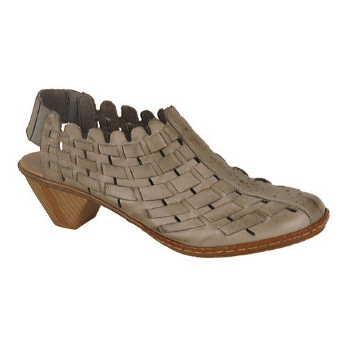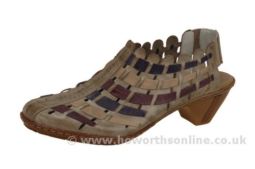 Create a look of trendsetting style and chic fashion this season in the Rieker Sina 46778 shootie. The supple leather upper of this women's open-heel shooty boasts beautiful, contrasting leather weaving and a deeply scalloped topline for a look that is fashionably unique. The elasticized heel strap provides easy on/off wear and a secure fit every time; the leather-covered, padded footbed provides all-day comfort and support while reducing foot fatigue. The modest wooden heel and polyurethane sole of the Rieker Sina 46778 will have you walking in sheer confidenceFeature