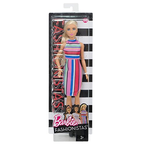 -. Binding : Toy -. Brand : Barbie -. EAN : 0887961426427 -. Feature : Barbie Fashionistas doll wears a fabulous dress with multi-colored horizontal stripes on the bodice and vertical stripes on the skirt / Black booties are right on trend, and a white bracelet is a chic accessory / Long blonde hair styled asymmetrical with a partial shaved head completes her fabulous look / Find your style and play out your stories / More variety makes collecting Barbie Fashionistas dolls even more fun. Collect them all (each sold separately, subject to availability) -. IsAdultProduct : 0 -. Label : Mattel -. Manufacturer : Mattel -. Model : DYY98 -. MPN : DYY98 -. PackageQuantity : 1 -. PartNumber : DYY98 -. ProductGroup : Toy -. ProductTypeName : TOYS_AND_GAMES -. Publisher : Mattel -. Studio : Mattel -. Title : Barbie Fashionistas 68 Doll -. UPC : 887961426427 -. Warranty : 1 year warranty against manufacturer defects