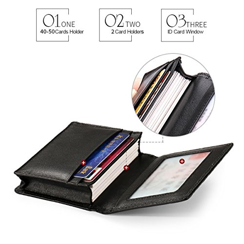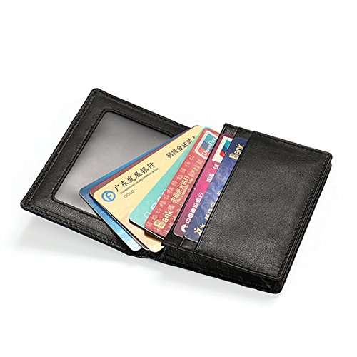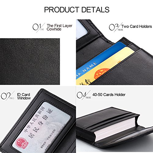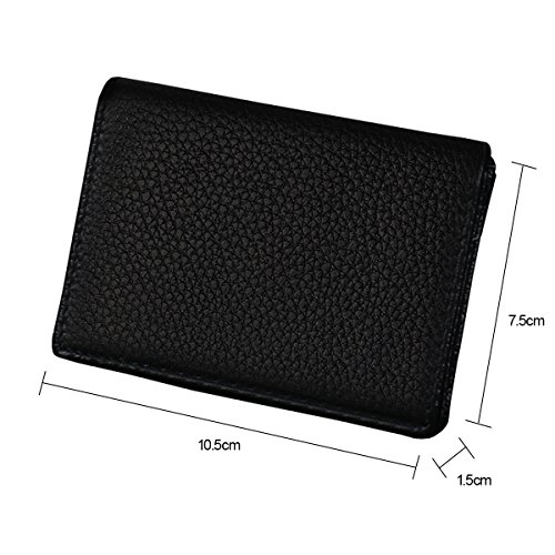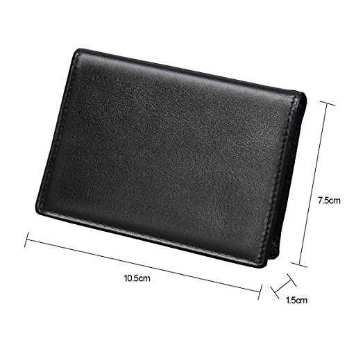 -. Feature : Premium Leather - Business Card Holder is made of high quality Cowhide leather (Soft and Smooth). Genuine Leather Wallet is the best choice as a gift. / Stores approximately 40-50 business cards, suitable for ID cards, credit cards, gift cards and more / Unisex Wallet -Unique and novelty in appearance, flexible storage of business cards, bank cards, ID, and more. Timeless styling perfect for both men and women. / CLASSIC FUNCTIONAL DESIGN - Measure 4.13"x2.95"x0.86"(10.5*7.5*2.2cm) Slim Small Mini body can be easily placed in front pocket/back pocket.Best choice for avoiding bulky looking wallets. / USEFUL FEATURE - 3 credit card/business card slots, 1 ID Card Window and 1 Main Pocket(Can put 40-50 cards). Best for your clients and associates and business man or other entrepreneurs