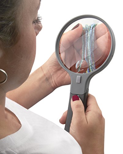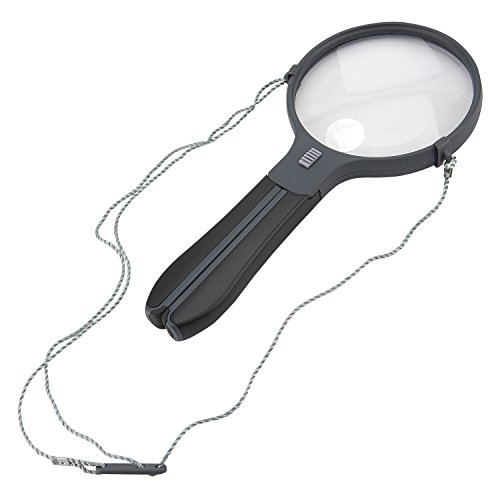 - Feature : Hand-Held or Hands-Free 2x Power Scratch Resistant Magnifier with 3.5x Spot Lens | Lens Diameter: 4.0 inches | Ergonomic and Comfortable Grip and Design / LED Lighted with 2 Super Bright LED Lights | Powered by 2 AAA Batteries (not included) | Great Low Vision Reading Aide / Included Neck Strap can be found in the Storage Handle of the Magnifying Glass | Compact and Lightweight / Perfect for reading, sewing, crafts, hobby, inspection, books, magazines, currency, coins, stamps and other tasks. / Built-in Rim to Protect the Acrylic Lens from Dust and Scratching | Backed by Carson's Limited Lifetime Warranty