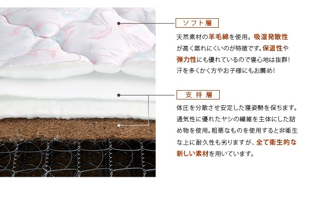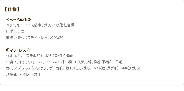 材質:[ベッド]本体-天然木・プリント紙化粧合板、床板-スノコ床板、[マットレス]側地-ポリエステル50%・ポリプロピレン50%、中身-ウレタンフォーム・パームパッド・ポリエステル綿・防虫不織布・羊毛、コイル-デュラテクノスプリング・コイル数450、通気孔-アイレット加工