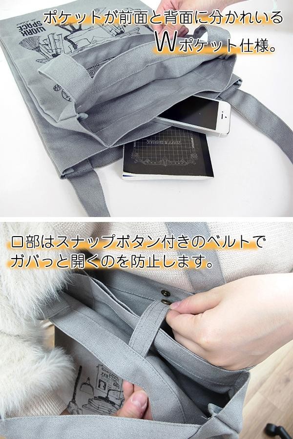 | ポケットが前面と背面の2つに分かれているダブルポケット仕様です♪ポケット中央の仕切りに、携帯電話やパスケースが入れられる小ポケットが付いています。口部はスナップボタン付きのベルトでガバっと開くのを防止します。 |