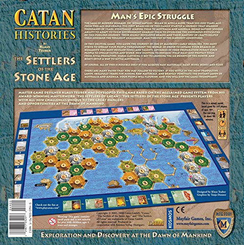 -. Author : Klaus Teuber -. Binding : Toy -. Brand : Mayfair Games -. EAN : 9781569050941 -. Feature : Based on the award-winning Settlers of Catan game system, presenting players with all-new challenges unique to the dangers and opportunities / You must strle to spread your people over the whole world / In order to expand your branch humanity you must develop certain talents / Advances in the preparation of food will allow your people to spread faster, while new hunting techniques can protect them from dangers / For ages 10+ years -. Genre : strategy -. IsAdultProduct : 0 -. ISBN : 1569050945 -. ItemPartNumber : 4098910 -. Label : Mayfair Games -. Manufacturer : Mayfair Games -. Model : MFG3201 -. MPN : Blank -. PackageQuantity : 1 -. PartNumber : Blank -. ProductGroup : Toy -. ProductTypeName : TOYS_AND_GAMES -. PublicationDate : 2002 -. Publisher : Mayfair Games -. ReleaseDate : 2006-09-08 -. SKU : MFG 3201 -. Studio : Mayfair Games -. Title : Settlers of the Stone Age -. UPC : 782361300950 -. Warranty : No Warranty
