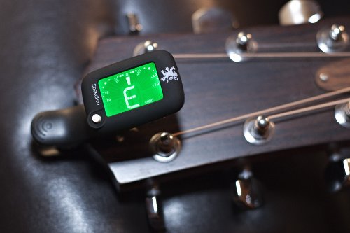 - Feature : Electronic guitar tuner clips on headstock; reads string vibration so room noise does NOT affect tuning. / Strong clip ensures high sensitivity vibration for accurate tuning clip. Quality workmanship ensures clip won't break off guitar tuner / Easy-to-read screen in all lighting environments + screen changes from blue to green when in tune for even easier reading by beginners / Easy open battery compartment; no tools required. Slip battery UNDER metal tab & pop cover back on. You're ready to tune! / 3 Year No Hassle Guarantee - Return It For Any Reason And We'll Replace It; No Questions Asked