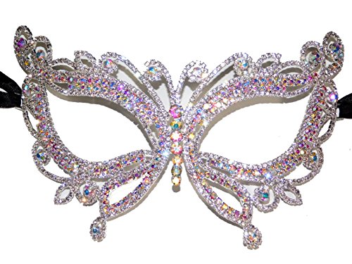 -. Title : Silver AB Iridescent Rhinestone Masquerade Butterfly Mask Mardi Gras Party