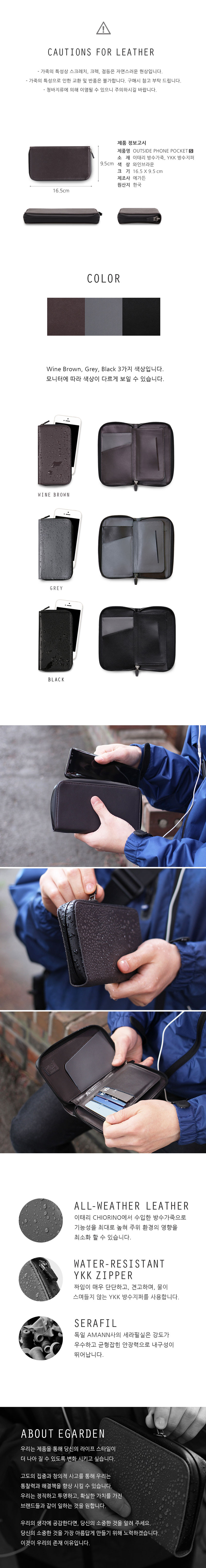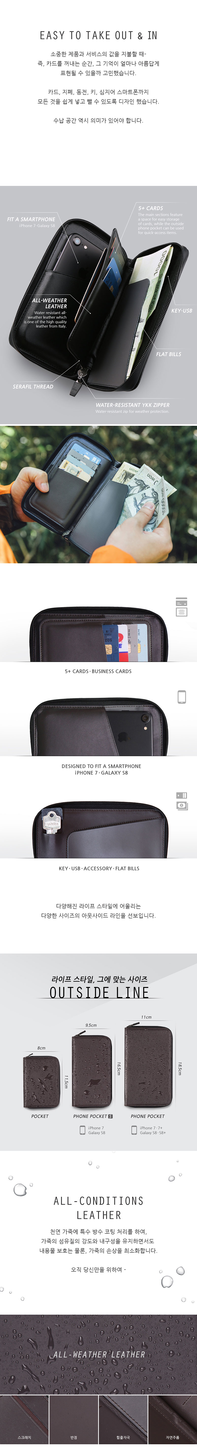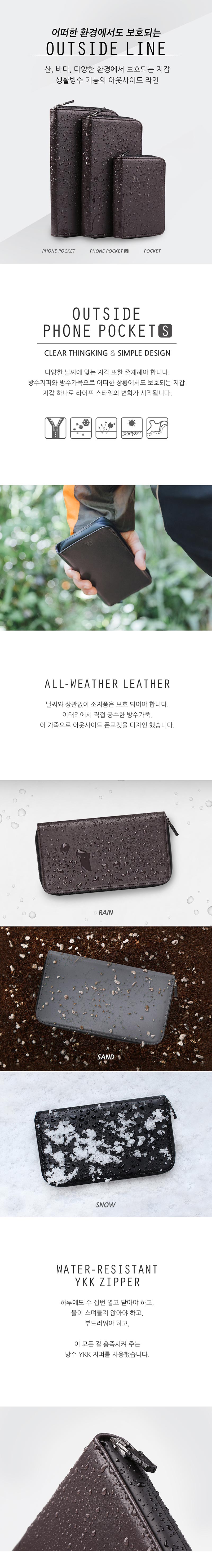 방수지퍼와 방수가죽으로 어떠한 상황에서도 보호되는 지갑.