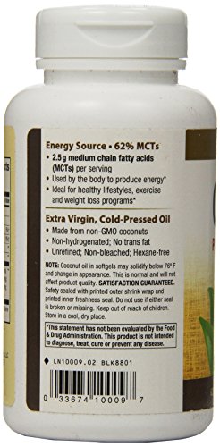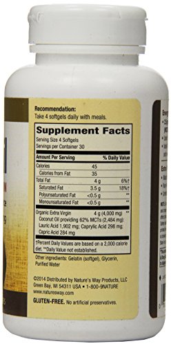 -. Binding : Health and Beauty -. Brand : Nature's Way -. Feature : Natural energy / 62 percent mats for natural energy / 2.5 gram of medium chain fatty acids (mats) per serving (lauric/caP.R.Ic/caprylic acids) -. Label : Nature's Way -. Manufacturer : Nature's Way -. ProductGroup : Health and Beauty -. ProductTypeName : HEALTH_PERSONAL_CARE -. Publisher : Nature's Way -. Studio : Nature's Way -. Title : Nature's Way Coconut Oil Soft Gels, 120 Count