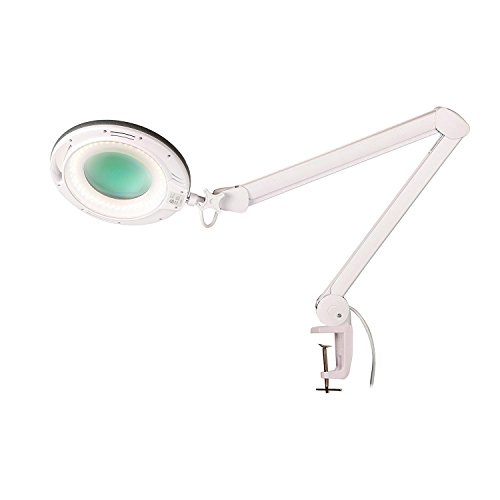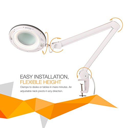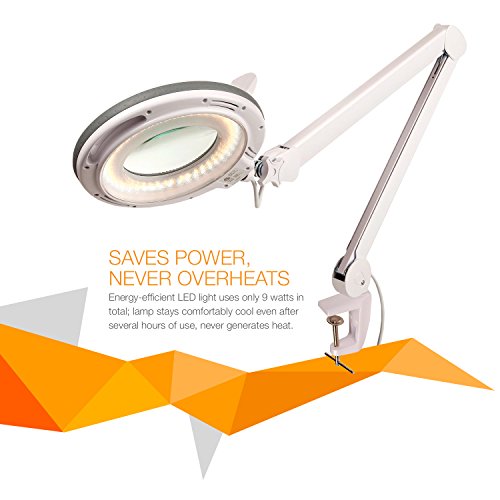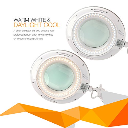 THE DIMMABLE MAGNIFIER LAMP THAT HAS BOTH WARM WHITE & DAYLIGHT COOL COLOR TEMPS: Advanced LED technology makes this the most versatile lamp on the market. A color adjuster lets you choose your preferred range: bask in warm white (3000-3500K) or switch to daylight bright (6000-6500K) for bringing intricate tasks into sharp focus, or chose any color level in between. By-touch dimmer on the lamp head helps you adjsut the brightness level.