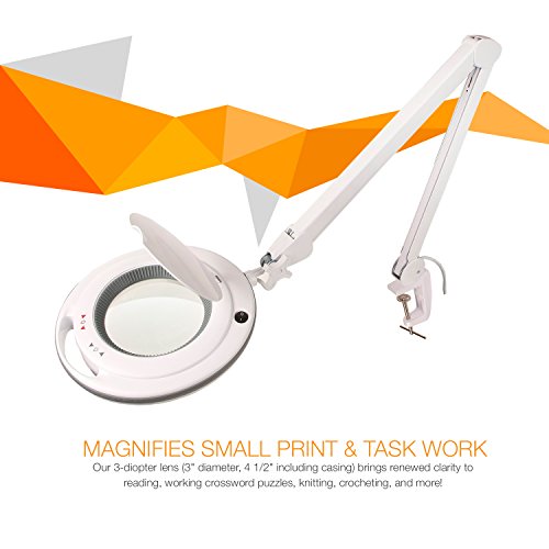 MAGNIFIES SMALL PRINT & TASK WORK: Our 3-diopter lens (3" diameter, 4 1/2" including casing) brings renewed clarity to reading, working crossword puzzles, knitting, crocheting, and more! Designed for aging eyes, this professional-quality 90-LED floor lamp boasts a 1.75X magnifier lens made of authentic diopter glass.
