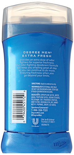-. Feature : Degree Men Extra Fresh Deodorant - Extreme 3 oz fights body odor 24 hours a day / Superior performance for all day extra freshness / Leaves no stains / Smell great all day long / Helps keep you fresh and energized