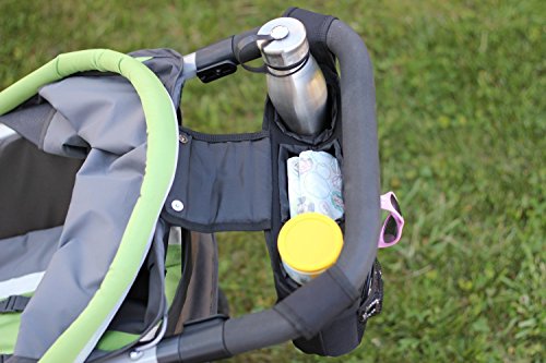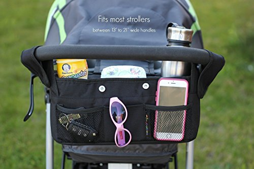 WELL DESIGNED: High quality 100% polyester material that easily wipes clean eco-friendly. Adjustable Velcro straps designed to accommodate various handle angles which easily attach to most strollers with handles between 13" and 21" (inches) wide. Provides convenient storage for all essentials while using your stroller.