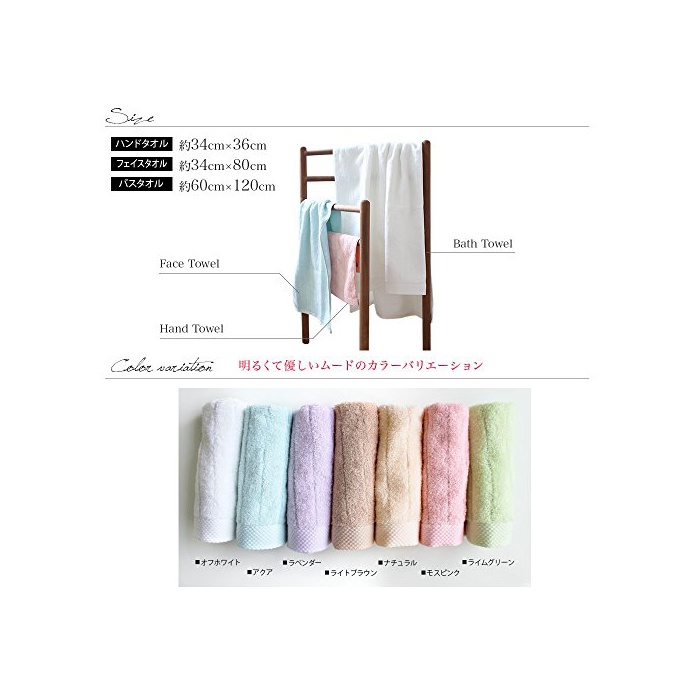 【페이스 타올 3 매세트】생산지:일본(이마바리 타올 인정 번호:제2017-1233호) 소재:면100% 사이즈:약34×80cm 컬러:오프 화이트,아쿠아,lavender,라이트 브라운,내츄럴,MOS 핑크,라임 그린 세트 내용:페이스 타올 동색3매