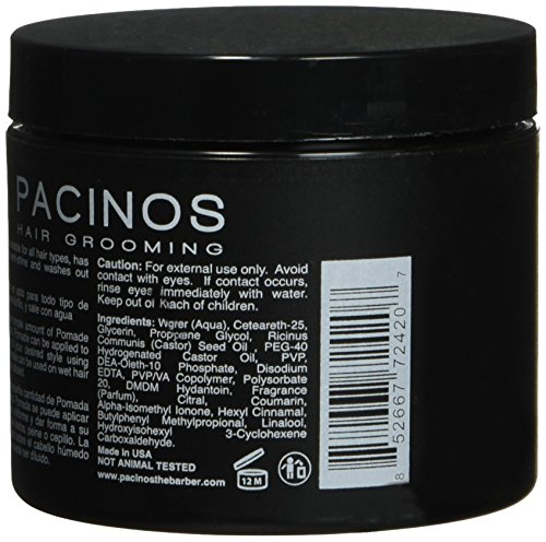 Feature : Firm yet flexible hold and a semi shine finish / Great for all hair types including straight, wavy, curly or coursed hair / Create many looks, such as, the comb over, the pompadour, and lay coursed hair down to create waves / Pacinos pomade is water soluble making it easy to rinse out