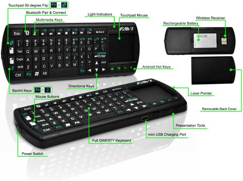 -Includes full QWERTY keyboard, touchpad mouse, laser pointer, android hot-keys, rechargeable battery