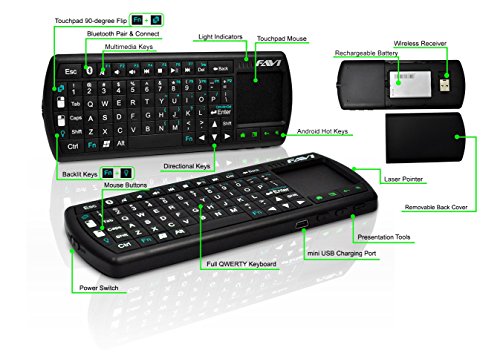 Includes full QWERTY keyboard, touchpad mouse, laser pointer, android hot-keys, rechargeable battery