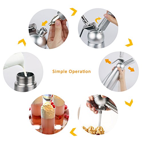 - VARIOUS SETS OF NOZZLES - Comes with 3 of plastic decorating tips and 3 additional stainless steel, the various nozzles allow different flows of the whipped cream and give your pies, cakes, waffles and hot/cold beverages a memorable, professional-looking presentation.