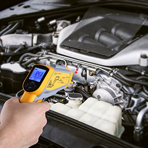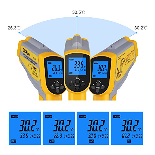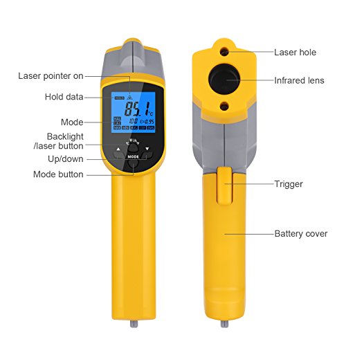 - ▲DUAL LASER & ADJUSTABLE EMISSIVITY - Dual laser infrared thermometer is more precise compared to most other IR Thermometer; Adjustable emissivity improves measurement accuracy across different surface types; temperature ranging is -58°F ~1022°F / -50°C ~ 550°C; Response time: ≤0.5S