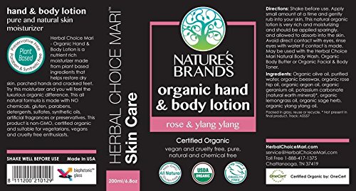 Nature's Brands' Herbal Choice Mari hand and body lotion is certified USDA Organic. This organic rose lotion with ylang ylang is truly pure and natural without harmful fragrances, preservatives or any synthetic chemicals. The aromatherapy scent will delight your senses. Formulated with plant ingredients that aid in keeping your skin moisturized. Its creamy texture penetrates your skin offering excellent healing benefits.Feature