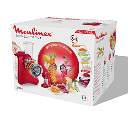 -. Title : Moulinex DJ812510 Reibe und elektrischer Zerkleinerer Fresh Express Max 5-in-1, Reiben, Schneiden/Feines Schneiden, gebürstetes Aluminium, Weiß / Rubinrot