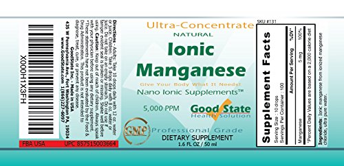 -. Binding : Health and Beauty -. Brand : Good State -. EAN : 0857515003664 -. Feature : Absorbs Much better than Pills! / Comes with Dropper! Small size - Very convenient for travel / Only 10 Drops equals 5 mg of Ionic Manganese - 100 Total Servings / Professional Grade - Natural Manganese - Gluten-Free! / Easy to Mix with Juice or Water. Can be taken Sublingually. -. IsAdultProduct : 0 -. Label : Good State -. Manufacturer : Good State -. Model : 131 -. MPN : 131 -. NumberOfItems : 1 -. PackageQuantity : 1 -. PartNumber : 131 -. ProductGroup : Health and Beauty -. ProductTypeName : HEALTH_PERSONAL_CARE -. PublicationDate : 2014-10-02 -. Publisher : Good State -. Studio : Good State -. Title : Good State - Liquid Ionic Manganese Ultra Concentrate - 10 drops equals 5 mg - 100 servings per bottle - 1.6 Fl. Oz -. UPC : 857515003664