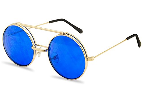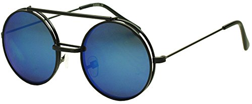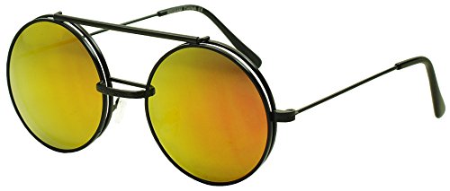 These awesome steampunk inspired sunglasses are coming in hot. They are crafted with a thick brow bar, a stylish metal nose bridge that projects in front of the frame, and mesmerizing flip up color mirrored lenses. These high fashion stylish sun shades are perfect for indoor and outdoor activities. No more need to take your stunning sunglasses off. With these you simply flip the cover lens up and continue to rock your fabulous look throughout your day. They are made with a thick metal based frame, classic metal hinges and UV protected polycarbonate lenses.Feature