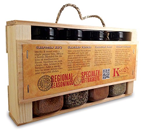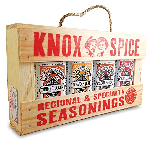 -. Feature : 4 gourmet seasonings for BBQ in a hand crafted crate. / • Knox's Chipotle BBQ dry rub seasoning for ribs and brisket. / • Knox's Yummy Chicken seasoning for yummy chicken, grilled, fried or baked. / • Knox's Cracked Pepper beef seasoning for all things beef. / • Knox's Jamaican Jerk BBQ seasoning for meat and vegetables.