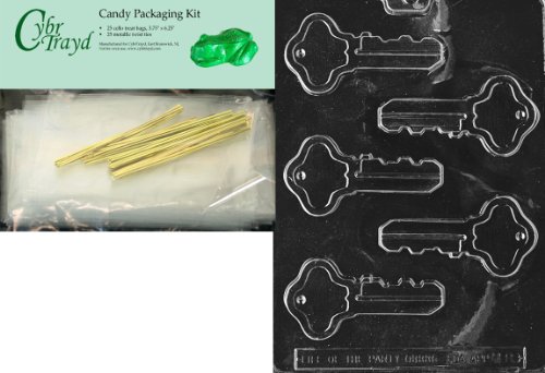 Cybrtrayd Keys Miscellaneous Chocolate Candy Mold with Packaging Bundle of 25 Cello Bags, 25 Gold Twist Ties and Chocolate Molding Instructions