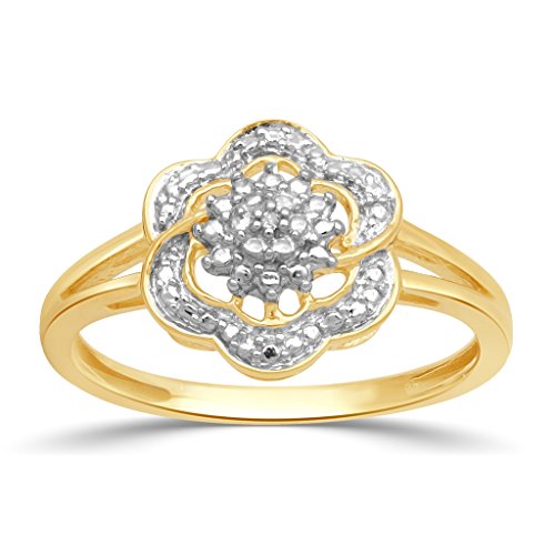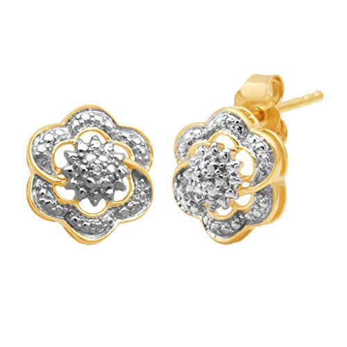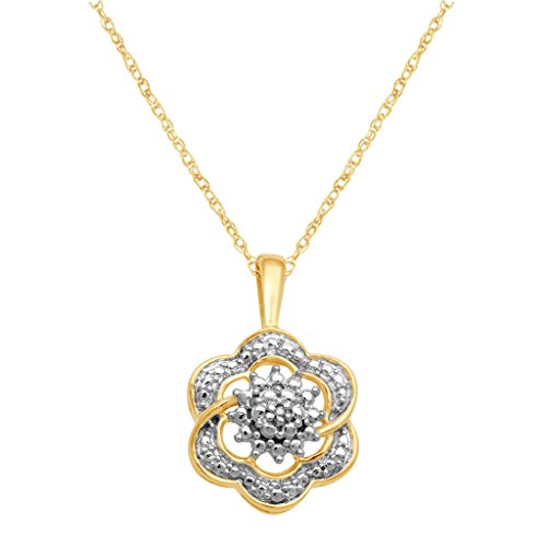 18 K Micron yellow plated sterling silver cluster pendant necklace, ring and stud earrings jewelry set. The pendant and ring are studded with round white diamond accent while the stud earrings are embellished with 1/14ct diamond in prong setting. The pendant Includes 18" rolo chain with lobster claw.
