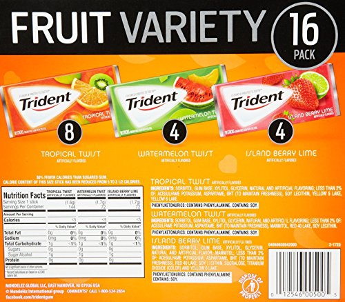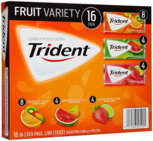 Trident fruit variety pack sugar free gum with xylitol: tropical twist, watermelon twist, island berry lime: 16 pack of 18 sticks.