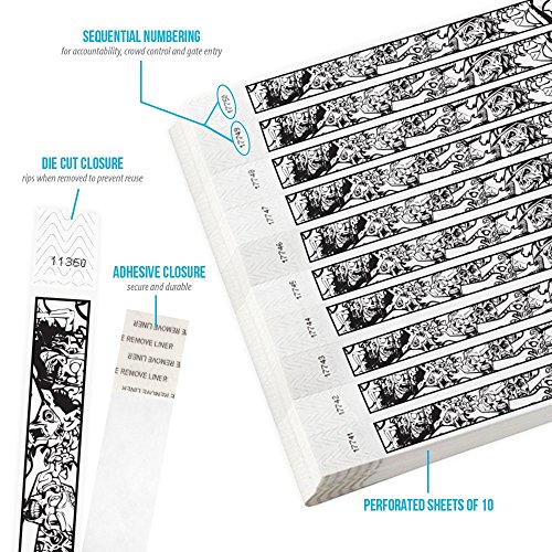 -. Feature : Waterproof / Non Transferable / Strong Adhesive Closure / 500 wristbands in sheets of 10
