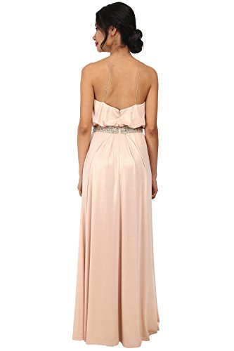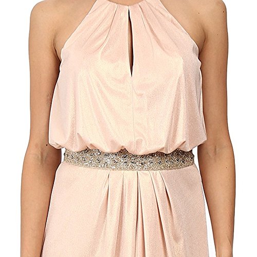 Shimmering, sleeveless gown flaunts a glamorously beaded inset belt. Halter neckline has a slit at the bust. Extra thin, fixed spaghetti straps. Pleated, A-line skirt boasts an open slit in the front. Concealed zipper in the back. Floor-length. Lined.Feature