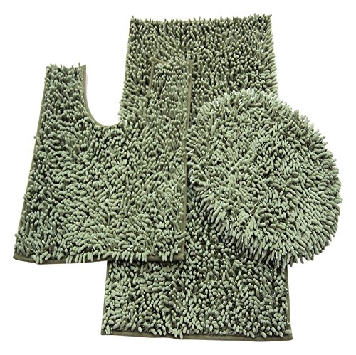 Daniel's Bath & Beyond 3 Piece Bath Set with 20" x 31" Bath Mat, 20" x 18" Contour Mat and 20" x 18" Lid, Chenille/Shiny Olive Green