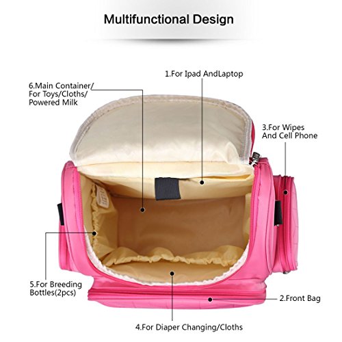 Smart Organizer: the side pockets fit wet wipes container, the front pocket is perfect for phone, keys and wallet, with the wraparound zipper pocket made for diapers. Inside there is a pocket on each side for a full sized bottle, a diaper changing pad. and two more pockets to hold back up pacifiers, clothes, diaper cream etc