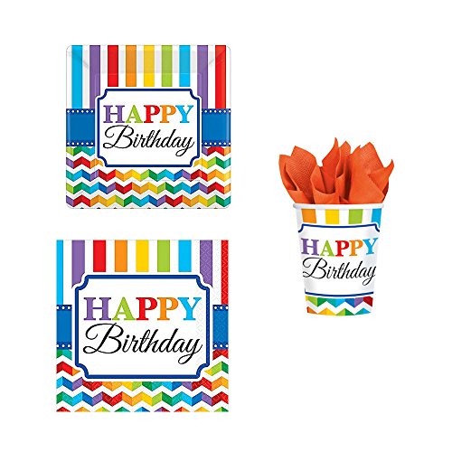 -. Feature : This happy birthday party pack is perfect for serving birthday cake! / 1 package 8 count paper cups 9 oz. / 1 package 16 count beverage napkins / 1 package 8 count paper dessert plates / Fun and vibrant colors are a perfect accent to your next birthday celebration!