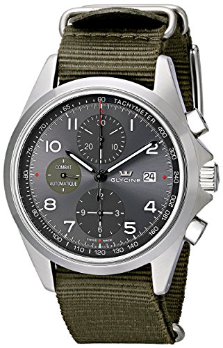 With excellence and style, the Combat collection carries with it the quality that Glycine is known for while creatively moving forward in assembling the perfect look. The smooth design underscores the precise automatic movement and superb chronograph complication, complements the warm gunmetal dial, and accentuates the comfortable army green nylon strap while propping up the strength of its spectacular 100 meter water resistance capability. Complete your collection with one today. This website is an authorized reseller of Glycine and each piece comes with the manufacturer warranty.