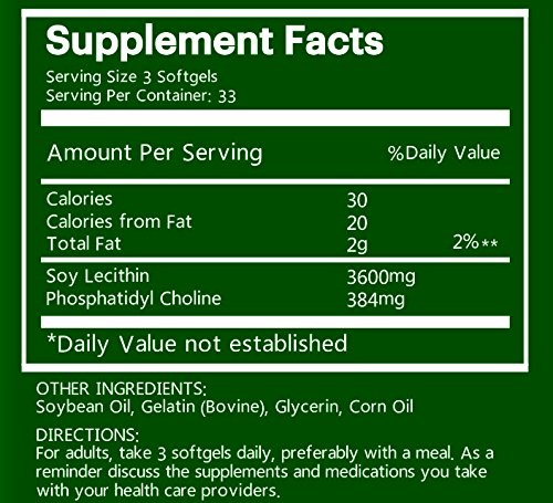 -. Binding : Health and Beauty -. Brand : Na'trition -. EAN : 6285862056042 -. Feature : Support Brain and Nerve Function - Promote Healthy Cell Structure - contributes to cardiovascular and nervous system health / 3 Month Supply - 300 Softgels - 1200mg per softgel - USP-Grade Lecithin Liquid - GUARANTEE the highest quality / Made in U.S.A. - FDA-Inspected Facility - We strictly follow good manufacture practices and deliver the best quality product to customer! -. Label : USA HPSON Pharmaceuticals Group LTD. -. LegalDisclaimer : Legal DisclaimerActual product packaging and materials may contain more and different information than what is shown on our website. We recommend that you do not rely solely on the information presented and that you always read labels, warnings, and directions before using or consuming a product. Please see our full disclaimer below. -. Manufacturer : USA HPSON Pharmaceuticals Group LTD. -. PackageQuantity : 3 -. ProductGroup : Health and Beauty -. ProductTypeName : HEALTH_PERSONAL_CARE -. Publisher : USA HPSON Pharmaceuticals Group LTD. -. Studio : USA HPSON Pharmaceuticals Group LTD. -. Title : 3 Bottles of Soybean Lecithin Softgels, 100 Softgels/ Bottle, Total 300 Softgels