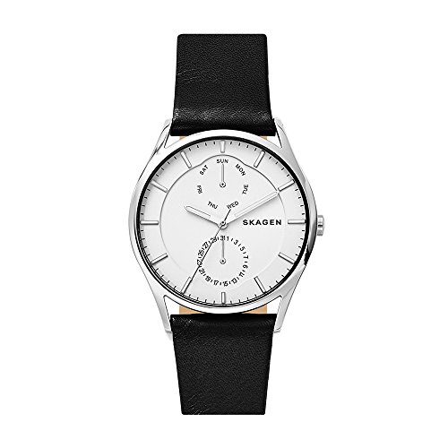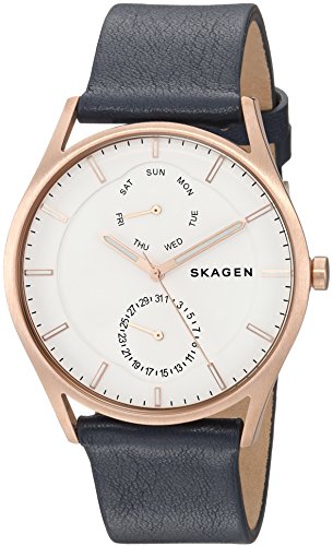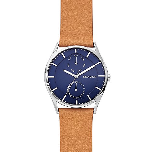 Skagen's Holst watch joins a beautifully uncluttered and symmetrical blue multifunction dial with day and date subdials on a traditional tan leather strap.